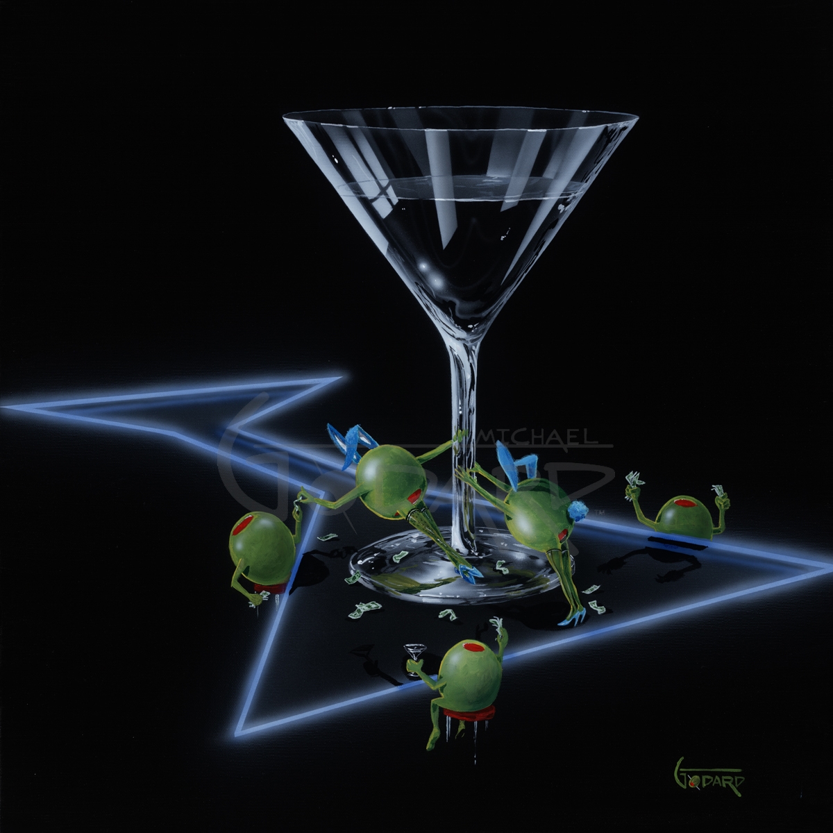 These olives are having the best time in the 4th piece in my Dirty Martini Series. The girl Olives with pimentos on the bottom are strutting their goods with the bunny ears on. The Guy Olives with the pimento on the top are having a great time with the entertainment. Check out the fishnet stockings, that’s Hot!